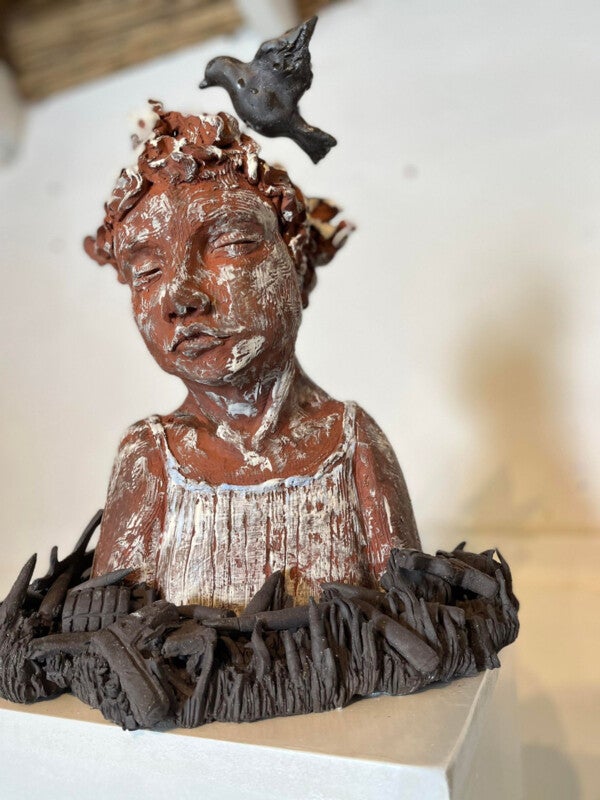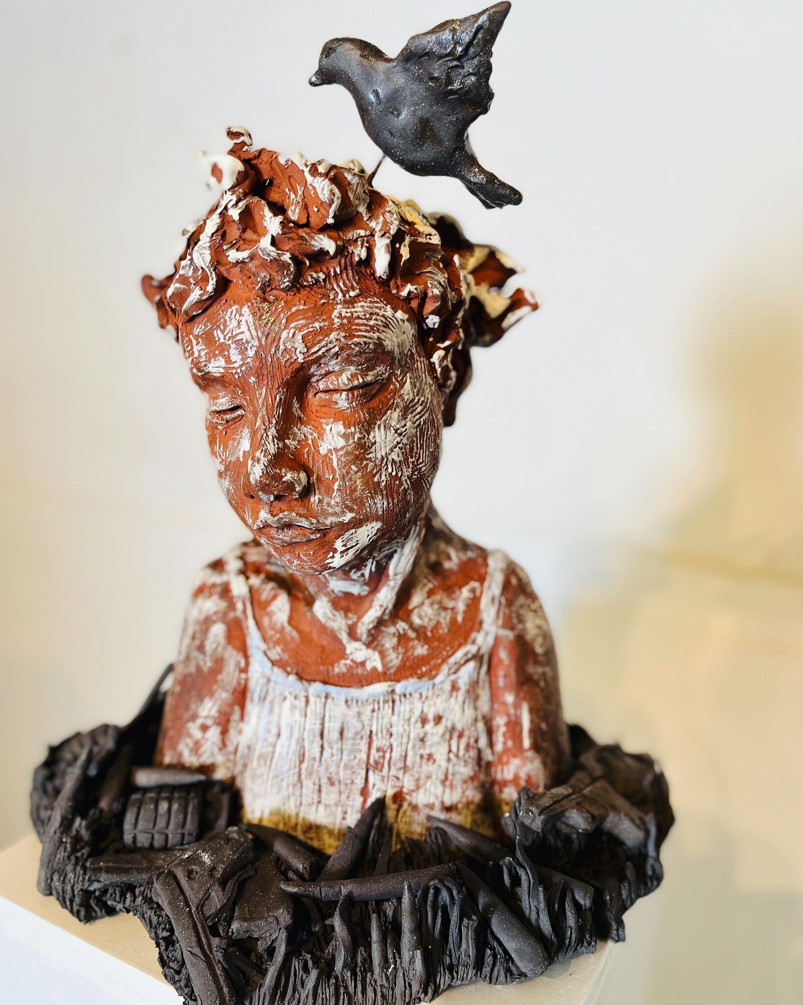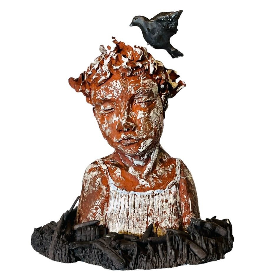 The title Fragile Peace reflects the urgency and vulnerability I felt while creating this piece. The work was initiated just before midnight on the eve of Russia’s invasion of Ukraine, as I listened to BBC World Radio announce the outbreak of war. This sculpture was shaped in the tumultuous first month of the conflict, with the addition of guns and a bird in response to the harrowing images and videos emerging from Bucha, Ukraine. The piece embodies the suddenness with which millions of women and children were forced to flee and seek refuge from violence. It represents the delicate nature of peace and the swift alterations that can upend lives.